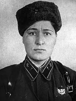 Vera Ivanovna Salbieva (Russian: Вера Ивановна Салбиева; 27 August 1910 – 27 June 1993) was an Ossetian Red Army officer. Nominated for the title Hero of the Soviet Union in 1942 by General Mikhail Kozlov for her bravery during a battle against an onslaught of advancing German soldiers in the summer of 1941, she was the first and only Caucasian woman nominated for the title; however, the nomination was downgraded so that she was awarded only an Order of the Red Banner instead.