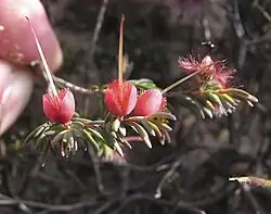 The flowers are arranged in small, pendulous groups near the ends of the branches, each flower on a stalk 1–2 mm (0.04–0.08 in) long. As they open, the flowers are surrounded by pink or red bracteoles that soon fall off. The floral cup is top-shaped, about 2.0–2.5 mm (0.08–0.1 in) long, with 10 prominent ribs and is hairy near its base. The sepals are pink to red or maroon, 3–4.5 mm (0.1–0.2 in) long, with 4 to 6 hairy lobes. The petals are egg-shaped, white, red, orange or maroon and 2.0–2.5 mm (0.08–0.1 in) long and are densely hairy on the outside. The style is gently curved, 12–16 mm (0.5–0.6 in) long with a few short hairs on one side, near the tip. Flowering time can occur in almost any month but mostly from August to November.[2][3]