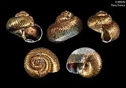 (Original description) The small shell is turbiniform, thin and umbilicated. It shows radiating ribs crossing spiral threads . The peristome is interrupted by the body whorl . The outer lip in the completely adult is reflected and somewhat thickened. The aperture is unarmed.[2]