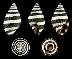(Original description) The shell is ovate and smooth. It is longitudinally rather obsoletely plicately ribbed, ribs granose towards the base. The whorls are conspicuously painted with alternate blue-black and white zones. The columella is three-plaited.[2]