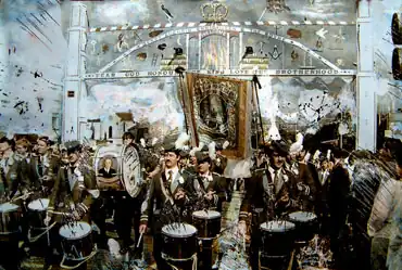 Sloan's works are a response to political, social and religious concerns. He is perhaps best known for his works investigating the Orange Order in series such as: Drumming; The Walk, the Platform and the Field and The Birches.[2]