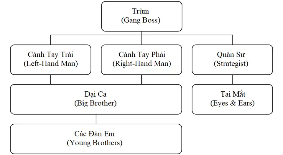 A larger criminal syndicate, băng đảng, has a clearer, more sustainable organizational structure with long-term operational goals. The leadership can have one or multiple people, but there is one individual at the top known as trùm. Below them is the command level with people who would be in charge of smaller groups within the syndicate. Ordinary members, known as đàn em, are those who directly carry out criminal acts, as well as all tasks assigned by the leaders.