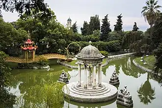 The park was designed by Michele Canzio, set designer for the Teatro Carlo Felice, and built between 1840 and 1846. It covers some 97,000 m2 of hillside behind the villa. Although recognizably in the English romantic style, the garden is highly theatrical, to the point of being organized as a series of scenes forming a play with prologue and three acts (Return to Nature, Memory, Purification). Structures and statues through the garden form focal points to this libretto.