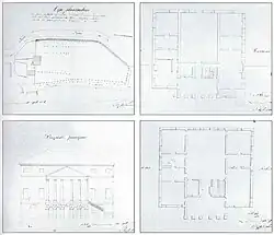 1.1 Francesco Vaccari, General plan of the estate belonging to the heirs in Fratta, with the ground floor elevation of the villa next to it (Lendinara, 15 April 1844). A.S.Ve., Notarial, Acts of Notary Antonio Santibusca, series II, b. 1095, lett. d,f. A IX and lett. d,f. C XI.1.2 Elevation of the main facade of the villa belonging to the heirs, with the elevation of the main floor plan next to it (Lendinara, 15 April 1844). A.S.Ve., Notarial, Acts of Notary Antonio Santibusca, series II, b. 1095, lett. d,f. B X and lett. d,f. D XII.[2]