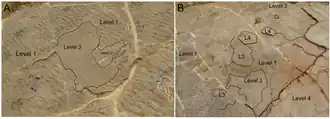 ![]() An ornithopod trackway at the Las Cerradicas site, Villar del Arzobispo Formation. Photographed around 2013.[1] | |