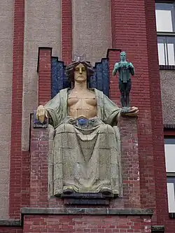 - the three figures at the crown of the Koruna Palace at the Wenceslas Square in Prague, 1912–1914