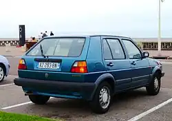 The Volkswagen Golf Mk2 is a hatchback, the second generation of the Volkswagen Golf and the successor to the Volkswagen Golf Mk1. It was Volkswagen's highest volume seller from 1983 and ended in (German) production in late 1992, to be replaced by the Volkswagen Golf Mk3. The Mk2 was larger than the Mk1; its wheelbase grew slightly (+ 75 mm (3.0 in)), as did exterior dimensions (length + 180 mm (7.1 in), width + 55 mm (2.2 in), height + 5 mm (0.2 in)). Weight was up accordingly by about 120 kg (260 lb). Exterior design, developed in-house by VW design director Schäfer, kept the general lines of its Giugiaro-designed predecessor, but was slightly more rounded. All told, about 6.3 million[2] second-generation Golfs were built.