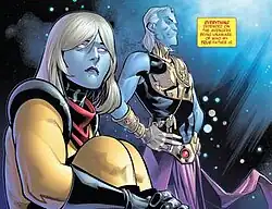 ![]() Voyager in her human disguise from The Avengers #675 (November 2018). Art by Pepe Larraz and David Curiel. | |
