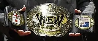 The WEW Heavyweight Championship (Japanese: WEWヘビー級王座, Hepburn: WEW Hebī-kyū Ōza) was a professional wrestling championship, originally created in Frontier Martial-Arts Wrestling (FMW) as the WEW Singles Championship (WEWシングル王座, WEW Shinguru Ōza), later being renamed as the WEW World Heavyweight Championship.[1][2] After FMW closed in 2002, the title became the WEW Heavyweight Championship in the World Entertainment Wrestling promotion, although carrying a new lineage.