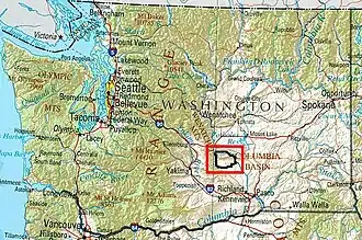 Wahluke Slope is approximately 145 miles (233 km) southeast of Seattle and immediately north of the Hanford Reservation of the United States Department of Energy (USDOE). "Wahluke" is a Native American word for "watering place," The appellation is within the vast Columbia Valley AVA and encompasses 80,490 acres (126 sq mi) with approximately 8,931 acres (3,614 ha) under vine which is nearly 15 percent of the state's total wine grape acreage. It is resident to more than 20 vineyards and at least three wine production facilities.[1][6] The region cultivates Merlot, Syrah, Cabernet Sauvignon, Riesling, Chardonnay and Chenin Blanc, but is primarily known for its Merlot and Cabernet Sauvignon.[7]