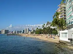 After the Waikiki War Memorial Natatorium was built adjacent to Kaimana and just off the shoreline, the beach was able to accumulate a vastly wider sandy beach which makes it so popular today. The name Kaimana is not an ancient Hawaiian name for the area, but is rather the Hawaiian pronunciation of the English name for the nearby Diamond Head.[10] The former Sans Souci site is now the New Otani Kaimana Beach Hotel.[11]