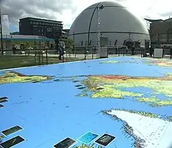 Waitangi Park showing walk-on world map and Les Arts Sauts performance dome