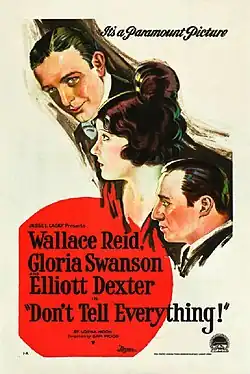 This is a comprehensive listing of Wallace Reid's (1891–1923) silent film output. Reid often played a clean-cut, well-groomed American go-getter on screen, which is how he is best remembered, but he could alternate with character roles, especially in his early short films, most of which are now lost. Some films have him as a director, some have him as an actor and some have him as both in particular his numerous short films. His first feature film is the famous appearance as a young blacksmith in The Birth of a Nation in 1915.[1]