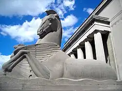 Two years after being rebuilt, the theatre was overwhelmed by the massive sized pile of marble and granite French Second Empire styled architecture with construction across the street to the west in the new domed Baltimore City Hall of 1867–1875 by George A. Frederick, (1842–1924), a municipal architect who also designed a lot of the structures in the new Druid Hill Park (established 1860) and other city structures. By the time that the theater and its surrounding block (Holliday to Fayette to North Gay to East Lexington Streets) was torn down in 1917, based on the 1910 plans of Frederick Law Olmsted, to make room for the newly laid-out War Memorial Plaza and Building, as a major rearrangement of a proposed new "civic center" of flanking municipal office buildings and structures providing additional space to be used in future decades, covering up the then unsightly canalized stream of Jones Falls to the east with its periodic flooding problems, and to open up a vista of the elaborate east front of the Baltimore City Hall, an influence of the then-nationwide "City Beautiful" movement among architects and city planners then coming to rise.[1] The War Memorial Building was designed by local famous architect Laurence Hall Fowler and originally dedicated to Marylanders who died in World War I and built in the early 1920s, dedicated 1925 and is one of many World War I Memorials for "The Great War" throughout the world built in the various participating Allied nations since the conflict of 1914–1918.
