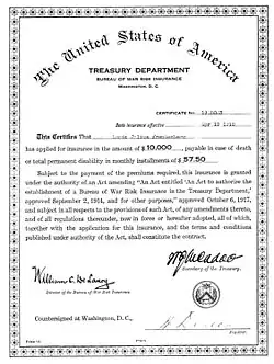 The War Risk Insurance Act was a piece of legislation passed by the United States Congress in 1914 to ensure the availability of war risk insurance for shipping vessels and individuals during World War I.[1] It established a Bureau of War Risk Insurance within the Treasury Department to provide insurance policies and pay claims. On October 6, 1917, the War Risk Insurance Act of 1917 amended the insurance program to make life insurance coverage available to sailors in the United States Merchant Marine.[1]