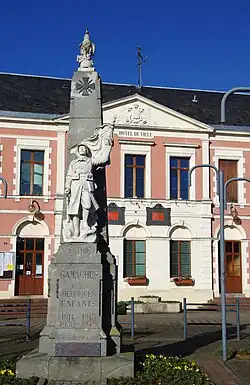 Gamaches Somme | At Gamaches there are two war memorials. One is in the Place du Marché and the second in the local cemetery. Both were erected by Dovergne-Seclet a builder and marbrier from Gamaches. Total cost was 25,970 francs of which 20,393 francs related to the monument in the Place du Marché. Inauguration took place on 21 August 1921. The main monument consists of a pyramid of Breton granite with a statue at the top. This is a statue of a soldier, the work entitled "le poilu en plein combat défendant le drapeau ". One would have taken this as being from the catalogue of Marbreries Générales Gourdon but it seems that the marbrier Gaudier-Rembaux of Aulnoye presented himself in March 1922 to the neighbouring village of Beauchamps as the author of the Gamaches work so there is a little confusion.[14] |