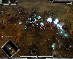 Some critics stated that the game's weak points included its complexity; some reviewers disliked how much micromanagement was required to effectively field one race against another, saying that this complexity was detrimental to the game. As one reviewer mentioned, "...when I stop having fun, I stop playing."[15] The learning curve was also stated as being very steep for an RTS, due to each race being different.[19] Another thing critics disliked was the player's inability to 'zoom out' with the in-game camera; this sometimes got in the way of large battles, and was especially noticeable when playing as or against the Tau, as their long-range weapons often resulted in them engaging their targets off-screen.[20] While general consensus on the revamped single-player campaign was positive, some critics felt that it was not particularly challenging; they found that the AI was strategically weak, and there were no random elements in most skirmish missions that would enhance replayability.[21] The usage of a random auto-resolve feature to determine which races won which territories was seen as a downside; also, one critic found that the AI attacked his homebase very rarely, and that they would attack insignificant zones regardless of the opportunity to capture more significant ones.[22] In terms of new additions, some critics felt that the races, in particular the Necrons, were overpowered.[15]
