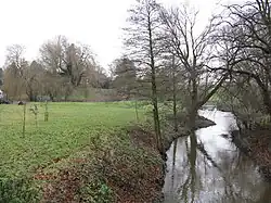 Warmingham village was historically centred around Warmingham Bridge across the Wheelock, which falls within a conservation area that also includes St Leonard's Church, Church House, Hill Top Cottage, Mill House, Island House and the Bear's Paw Hotel, extending to cover earthworks east of the village centre.[31][43] There are two separate sets of earthworks: one is at the site of the 13th-century watermill, and represents the dam, leat and mill pond; the other is a partially moated site associated with Sir John Trussel's manor house.[6][31][44]