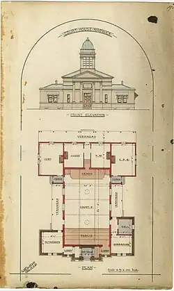 The design for the court house was prepared by the Department of Works, John James Clark being Queensland Colonial Architect at the time. The contract price for the building was just over £3700. The contractor for the building was William G Conley, and John McCullough completed the stonework on the building.[1]