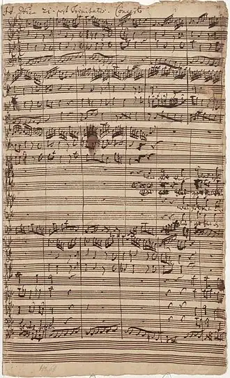 The cantata is scored like chamber music, especially compared to the chorale cantatas on the same chorale with a melody by Severus Gastorius.[6] In the opening chorus, the mostly homophonic setting of the voices, with the oboes playing colla parte, is complemented by strings dominated by the first violin as an obbligato instrument rather than an independent orchestral concerto. The final line is in free polyphony, extended even during the long last note of the tune. All voices have extended melismas on the word "walten" (govern), stressing that God is "ultimately in control". Strings and voices alternate in the bar form's two Stollen, but are united for the Abgesang.[2][4]