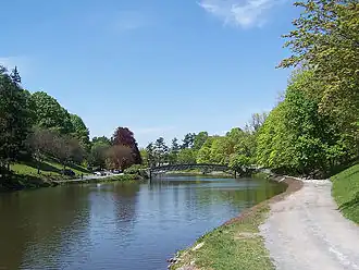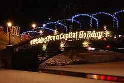 Washington Park Lake is a body of water in Albany, New York located in the southwestern corner of Washington Park. It has a surface area of 5.2 acres (21,000 m2) and a mean depth of 6.6 feet (2.0 m). The deepest sections of the lake are just over 11 feet (3.4 m) deep.[1] The lake is roughly 1,600 feet (490 m) long and 140 feet (43 m) wide. [2][3] Next to the lake is the Washington Park Lakehouse and an amphitheater where the Park Playhouse performs musicals in the summer. A wrought-iron pedestrian bridge spans the lake at its narrowest point. The footbridge over Washington Park Lake is the only remaining original structure in Washington Park. Erected over the lake in 1875 the lamps on the bridge were originally gas burning but were electrified in 1881.[4] Ice skating is permitted on Washington Park Lake, though swimming is prohibited.[5]