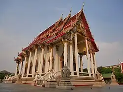 In addition, sala kan parian (sermon hall) is also beautiful and said to be the only one in Thailand. It is entirely made of carved-wooden partition and has exquisitely beautiful carvings telling stories from the Sudhanujataka, part of the Paññāsa Jātaka. This wooden house should have been built around the reigns of King Nangklao (Rama III) to the King Mongkut (Rama IV).[5][6][2]