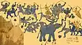 The interior and exterior of the sim contain painted murals created by local artisans with powder paints in indigo, green, yellow, black, and brown; the brightly colored murals are designed to stand out from their light, cream-colored background.[7] The interior murals include thirteen chapters of the Vessantara Jātaka depicted in panels similar to the cloth scrolls used to tell the same stories of Buddha's life during local Bun Phawet festivals with captions naming each scene.[8] The exterior murals are mostly scenes from the Sinsai epic, the Isan version of the Lao Sang Sinxay epic. The story of the rescue of a princess from a yaksha by her three nephews begins on the south wall of the sim and travel clockwise around the building. On the west wall, the Sinsai retelling is interrupted by a panel depicting scenes from hell (naraka).[9]