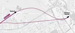 In 2011, more than 80 years after the MR first attempted to extend its line into central Watford, a new scheme was approved to continue the Metropolitan line across the town to Watford Junction station. This Metropolitan line extension is also known as the Croxley Rail Link.[15] A disused stretch of former British Rail track which ran to Croxley Green station would be reinstated, connecting the Metropolitan line with the Watford DC Line at Watford High Street (London Overground) and sharing track to the terminus at Watford Junction. The project was to be funded jointly by Hertfordshire County Council and Transport for London. Had this project gone ahead, Watford tube station would be closed to passengers.[16]