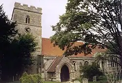 The oldest parts of the Church of England parish church of St Leonard are Norman, including a diapered tympanum that was over the north door until this was dismantled for the building of the north aisle. The church was extensively rebuilt in the 14th century, and the arcade of the south aisle survives from this period.[15] The south chapel is 15th century, built for Maud Warner as a memorial for her husband Richard, a woolman.[2] The tower is also Medieval. A few Decorated Gothic and Perpendicular Gothic windows survive, but in the 1870s some were moved to different positions within the church. In 1763 Edward Horne, a local landowner, obtained permission to build a burial vault east of the Warner chapel and south of the chancel.[2] In 1877 the architects H.J. Tollit and Edwin Dolby restored St Leonard's.[15] The church is a Grade II* listed building.[16]