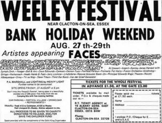 Weeley Festival was organised by Clacton Round Table as a small charity fundraising event for around 5,000 people.[1] When plans for that year's Isle of Wight Festival fell through, focus shifted to Weeley and the festival grew in importance. Advance ticket sales were over 100,000, and estimates of attendance were between 110,000 and 150,000.[2] The festival took place over the August Bank Holiday. The event was promoted as being non-stop music with acoustic acts scheduled to appear between the electric acts, and the music went on day and night.