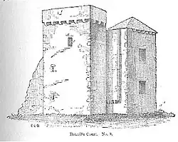 The main concentration of tower houses is in southern Pembrokeshire, Wales. These were first published with detailed drawings in 1877–8 by Rev. E L Barnwell.[2] The Pembrokeshire examples have a coastal distribution; this is also true of the Monmouth and Glamorgan tower houses, as well as the demolished examples at Penhryn (in Caernarfonshire) and Ty Gwyn (in Abermo).[3] Otherwise, the tower houses are distributed along the Welsh—English border, with one example, Wattlesborourgh, just over the border in Shropshire. In 1976, Hilling produced a map (with listing) showing seventeen examples.[4] Further houses have been added by Suggett and it is possible that new examples will be recognised as being incorporated into existing buildings, as at Sandyhaven House in Pembrokeshire.[5]