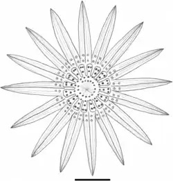 Although the morphology of Weltrichia is highly variable, the overall morphology consists of a central cup-like structure surrounded by a number of radially symmetrical outward projecting rays, to which are attached bivalve-shaped pollen sacs/synangia. The number of rays varies from 9/10 to 30, depending on the species, and the total diameter from 3 centimetres (1.2 in) to over 20 centimetres (7.9 in). Both the cup and rays usually (but not always) have substantial thickness, in some of the thicker species the structure is noticeably woody. The pollen is monocolpate and elliptical. In some species, additional rays project over the central cup, and attractants/resinous substances are present within the cup. The rays also sometimes have ridges, trichomes, appendages, striae and/or unipinnate (pedicellate) pollen sacs present. Species of Weltrichia appear to have primarily been wind pollinated, though some species may have been pollinated by insects, such as beetles. They were borne by the same plants that also bore female ovulate cones assigned to Williamsonia.[1] It is unclear whether the parent plants were monoecious (having both structures on one plant) or dioecious (where each plant only has one gender of reproductive organ). At least some bearers of Weltrichia, such as Kimuriella from the Late Jurassic of Japan were low growing divaricately branching shrubs with a maximum height of 2–3 metres, while others such as Williamsonia gigas may have been more cycad-like in morphology.[2]