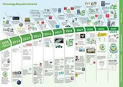 Recycled plastic was first used in production during 2008; the Recyclat Initiative was officially launched in 2012. The initiative collaborates with other partners, including the Green Dot, with the aim of making greater use of plastics sourced from household waste. It calls on politicians and the general public to advocate a higher recycling rate in order to protect the climate and the oceans. In addition, the company seeks the advice of the German Nature and Biodiversity Conservation Union NABU in its Recyclat Initiative.[18] Packaging has consisted to 80% of recycled plastics – initially sourced mainly from plastic bottles – since 2010.[19] Detergent bottles used by the Frosch brand are now made entirely from recycled materials.[20] In 2019, the firm launched the first shower gel bottle made completely from recycled plastic obtained from the Yellow Sack.[21]