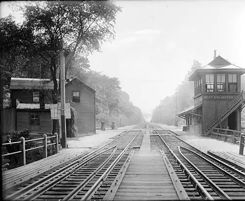 West Arlington station opened on January 1, 1873 with the opening of the Montclair Railway between Jersey City and Monks in West Milford in Passaic County. At the time of opening, the station retained the name of Kearny.[4] The station was located at the end of a cut, 0.5-mile (0.80 km) west of Arlington station.[5] West Arlington station, which doubled as the control tower for nearby WR Draw, served passenger trains until September 30, 1966, when the Erie-Lackawanna Railroad discontinued passenger service to the station after a final Caldwell Branch train crossed.[3] The station depot on the eastbound platform remained, standing abandoned until it burned down in 1983.