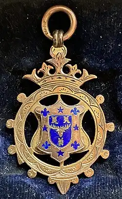 West Bromwich Charity Cup medal (obverse), awarded to Edmund Wood in the 1901-02 season. The decoration is based on the coat of arms of West Bromwich