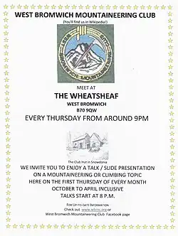 Early in 1951 Bert Wright, a member of the Climbers' Club, was asked by his Local Education Authority to develop camping trips & outdoor activities for local schoolchildren. At that time there were only 3 outdoor centres in the whole country and no certificates of mountain leadership of any kind, so he set about organising mountaineering courses for schoolteachers based at Helyg and Ynys Ettws huts in Snowdonia. The idea of forming a mountaineering club in West Bromwich materialised while participants socialised at The Royal Hotel (now Plas y Brenin) and the Pen-y-Gwryd. The first meet was to the Long Mynd on 13 January 1952, the first committee meeting on 23 May and the inaugural Annual General Meeting held at the Arden Hotel on 16 October 1952, at which Wright became the first chairman. The "Star and Garter" was the club's first home until it moved to "The Globe" in 1959 where it has remained until September 2012 apart from brief spells at "The Flowerpot" and "Merry Go Round".[1] Sir Chris Bonington contributed the forward to a book published in 2002 celebrating the club's golden jubilee.[2] The group produces a monthly newsletter and copies of these going back to 1989 have been deposited with Sandwell Community History and Archives Service at Smethwick Library and can be consulted there.[3]