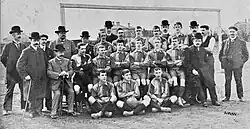 The original club wore chocolate and white vertical striped shirts from 1888.[10] By 1902 the revived club was wearing plain white shirts[11] and by 1904 it had adopted amber and black halves, with black shorts and socks.