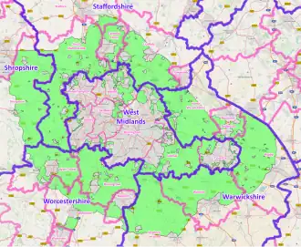The West Midlands Green Belt is a statutory green belt environmental and planning policy that regulates the rural space within the West Midlands region of England. It is contained within the counties of the West Midlands, Shropshire, Staffordshire, Warwickshire and Worcestershire. Essentially, the function of the green belt is to rigorously manage development around the cities, towns and villages in the large West Midlands conurbations centred around Birmingham and Coventry, discouraging convergence.[1] It is managed by local planning authorities on guidance from central government.