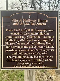 Plaque of halfway house and stone basement at West Platte, Missouri