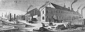 The earliest known records of the West Street Foundry, also known at this time as Howell & Coffee, date to 1839.[1] Principals of the firm were Joseph E. Coffee, then a 28-year-old engineer, and Maelzaer Howell.[2] With Howell's death in 1842,[3] Coffee became sole proprietor,[4] and would continue his association with the firm throughout its history. Coffee's younger brother, George Wayne Coffee, was also an engineer and an associate of the firm.[5][6] The business was located on the northwest corner of West and Beach Streets, Brooklyn, New York.[7][8]