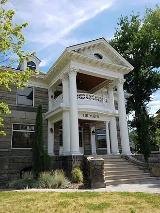 - Timothy Regan House (1905), 110 W Main St, 2-story Colonial Revival designed by Tourtellotte & Co.[24] Timothy M. Regan was an executive of the Boise City National Bank, and he helped to organize the Boise Artesian Hot and Cold Water Co.[25]