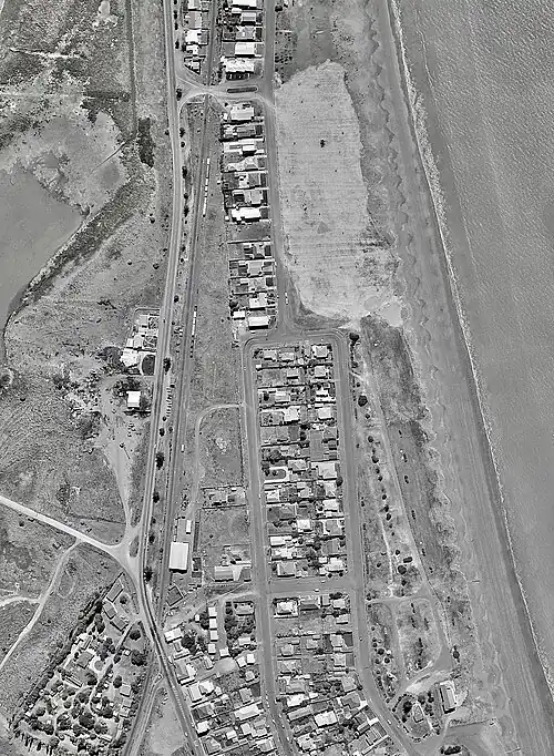 The Prime Minister, Bill Massey, officially opened the line at its junction in Napier on 14 November 1922,[5] but Napier-Eskdale passenger trains only ran from 20 July 1923, taking 10 minutes from Napier,[6] and a Saturday afternoon return train from Napier to Westshore was trialled in November 1923.[7] A Sunday train was added in 1925,[8] but replaced by a railway bus from February 1930,[9] as it was thought cheaper than running trains.[10] In 1924 almost a mile of line between Westshore and Bay View was undermined by the sea.[11] In 1928 the stockyards were moved to Waipunga.[12] In 1945 a railcar hit a truck at a railway crossing, killing 5 men in the truck, but not injuring any passengers.[13] In 1947 Westshore was scheduled to be 6 minutes from Napier by railcar.[14] Buses now take about 25 minutes for the journey.[15]