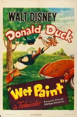 Wet Paint is a 1946 American animated short film directed by Jack King and produced by Walt Disney, featuring Donald Duck.[1] In the short film, Donald re-paints his car, and a bird lands on it. In the mayhem that ensues, the car ends up covered with handprints, spotted a dozen different colors, stripped of paint, and covered with the stuffing from the seats so that it resembles a sheepdog.