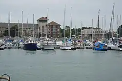 Weymouth Marina occupies most of the inner backwater of Weymouth Harbour, Dorset, England. The marina was refurbished to accommodate more vessels in the 1990s, and today houses hundreds of pleasure cruisers, fishing boats, yachts, dinghies and speedboats. Access to the marina is via a lifting road bridge across the harbour between Weymouth and Melcombe Regis.