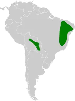 The white-bellied nothura prefers dry shrubland regions up to 500 m (1,600 ft) in altitude.[5] It can also be found in dry grassland, savanna, caatinga, and occasionally pastures.[1] This species is native to northeastern and central Brazil, eastern Bolivia and Paraguay.[3]