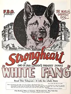 White Fang is a 1925 American silent Western film directed by Laurence Trimble and featuring Theodore von Eltz, Ruth Dwyer, and Matthew Betz.[1] It was produced by FBO Pictures as a starring vehicle for Strongheart, a German Shepherd who appeared in a number of films during the decade. It is based on the 1906 novel White Fang by Jack London.[2]