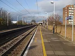 White Hart Lane is a station on the Weaver line of the London Overground, located in Tottenham in the London Borough of Haringey in North London. It is 7 miles 11 chains (11.5 km) from London Liverpool Street and is situated between Bruce Grove and Silver Street stations.[2] It is in Travelcard zone 3. The station is close to Bruce Grove and the Tottenham Hotspur Stadium, the home ground of Tottenham Hotspur Football Club.