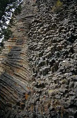 The Rock Roses are a unique collection of small columns. Unlike most formations of columnar basalt which are vertical like organ pipes, these are horizontal and the ends of the columns point out, rather like the tiles on a shower wall. About 50 m (164 ft) further west, the columns suddenly change direction and resemble the wall of a log house. The Rock Roses were formed by the molten lava in the dyke contacting the cooler and older adjoining rocks.[2]
