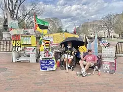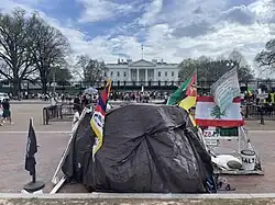 ![]() The Vigil, staffed by volunteers Philipos Melaku-Bello (left) and Joe Brown (right), with Lafayette Square in the background, March 2025. ![]() The Vigil facing the White House, March 2025. | |