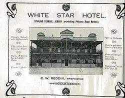White Star Hotel is a heritage listed building that operates as a hotel in Albany in the Great Southern region of Western Australia. The hotel is located adjacent to the Royal George Hotel on Stirling Terrace, once the commercial and social centre of town,[1] overlooking Princess Royal Harbour.[2] The building was named for the White Star Line, an important shipping and passenger line that once operated out of Albany.[3]